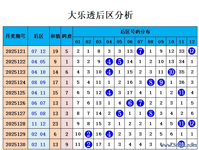 上期转头:大乐透第2025130期奖号为:前区01、13、16、27、29,后区02、11,前区奖号012路比为1:3:1,奇偶比为4:1,后区开出2路、2路组合02、11